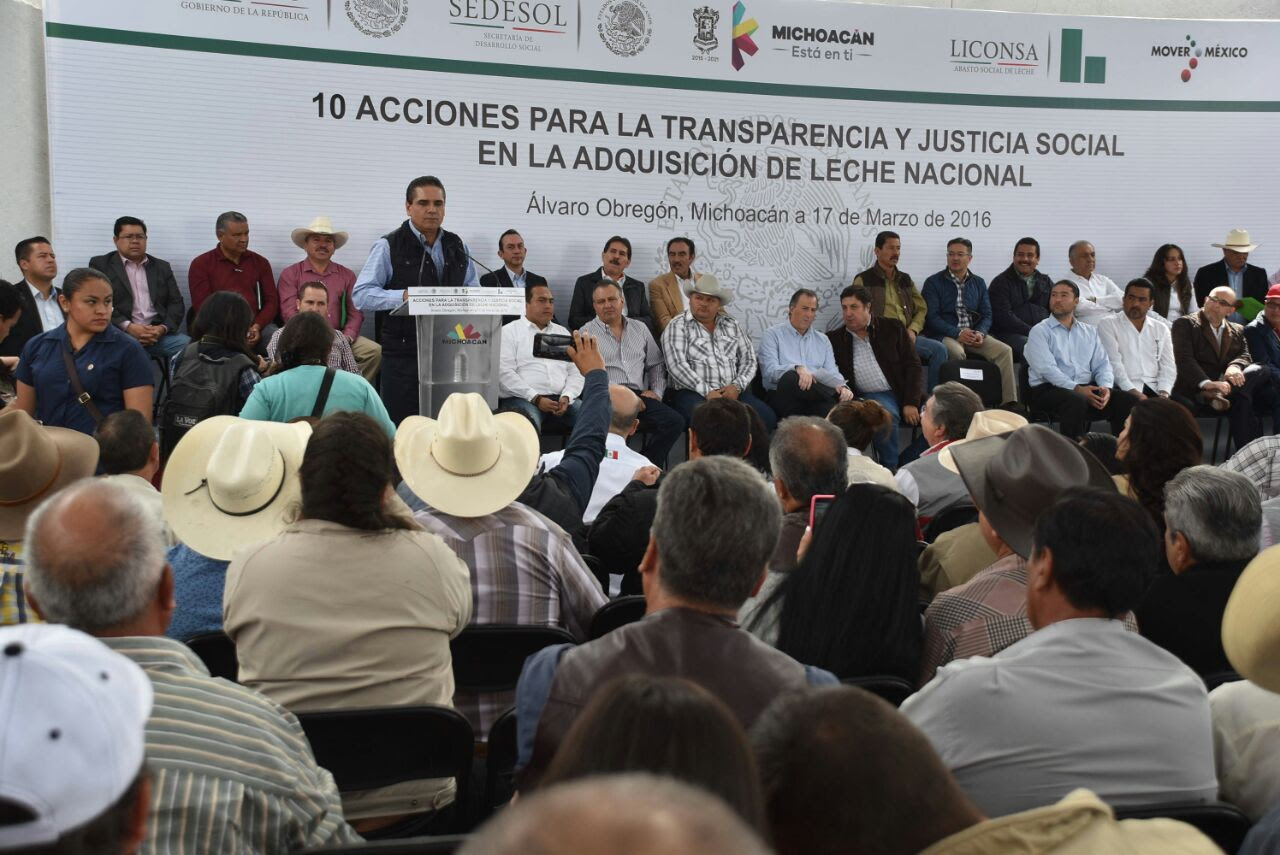 El funcionario federal apuntó que desde Michoacán, por indicación del titular de la Sedesol, se anuncian las 10 medidas en favor de los productores de leche, las cuales son: Transparencia en padrón de proveedores; Establecimiento de comités estatales de auditoría, evaluación y seguimiento; Regulación de intermediarios y comercializadores; Auditoría permanente a centros de acopio; Apoyo a productores para créditos en banca de desarrollo; Transparencia en el proceso de venta de crema; Firma de convenio con Profeco para que esta institución supervise, evalúe y constate la calidad del producto lácteo; así como apoyos a productores Liconsa; Campaña nacional para incentivar el consumo de leche y Privilegiar compra de leche nacional sobre importaciones.