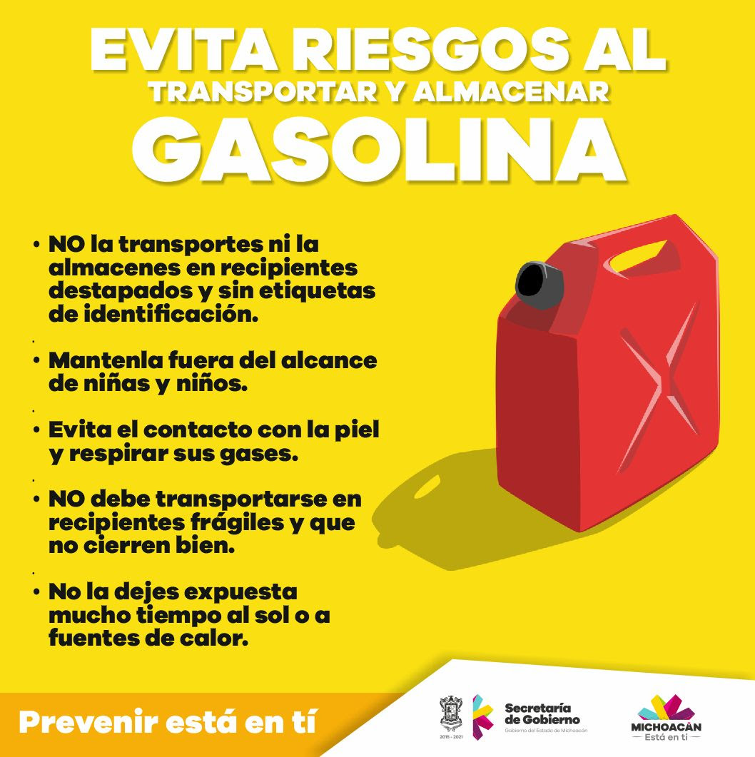 Morelia, Michoacán. La Secretaría de Gobierno, a través de la Coordinación Estatal de Protección Civil, reitera a la población en general sobre los riesgos de transportar y almacenar gasolina.