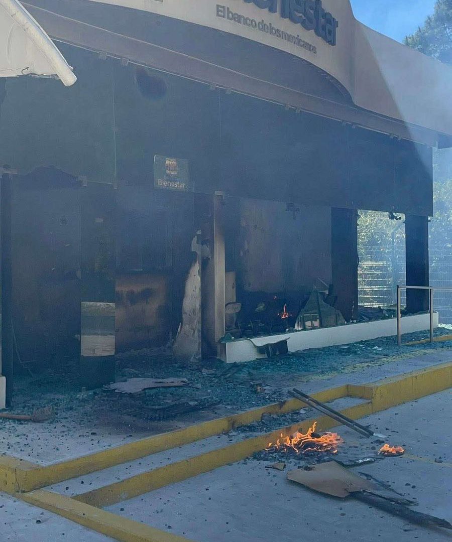 Morelia, Michoacán.- Durante la jornada de violencia que se registra este domingo en distintos municipios de Michoacán, sucursales del Banco del Bienestar fueron blanco de ataques a manos de civiles.