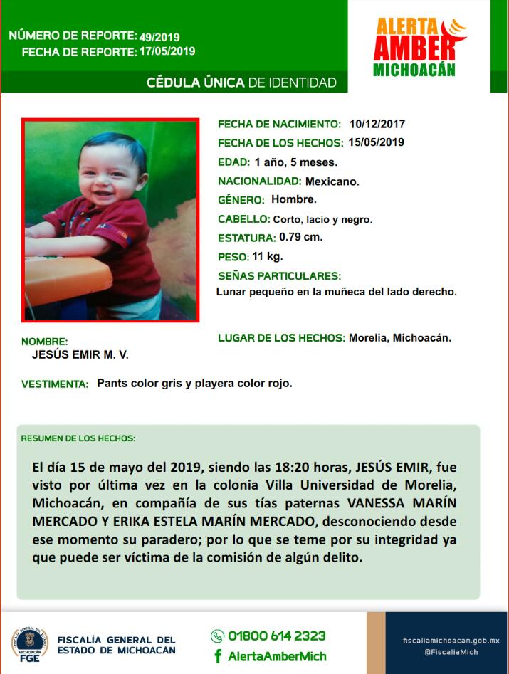 De acuerdo a la Alerta Amber que emitió la noche de este viernes la FGE, el menor de nombre Jesús Emir M. V., de un año y 5 meses de edad, fue visto por última vez en compañía de dos tías paternas en la colonia Villa Universidad.