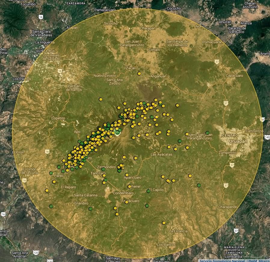 El evento de mayor magnitud, hasta el momento, ha sido de 3.8 grados en la escala de Richter. La actividad sísmica se concentra en un radio de 30 kilómetros alrededor de las coordenadas 19.423° de latitud y -102.273° de longitud, una zona ubicada entre los municipios de Tancítaro y Uruapan, reconocida por su cercanía con la Faja Volcánica Transmexicana.