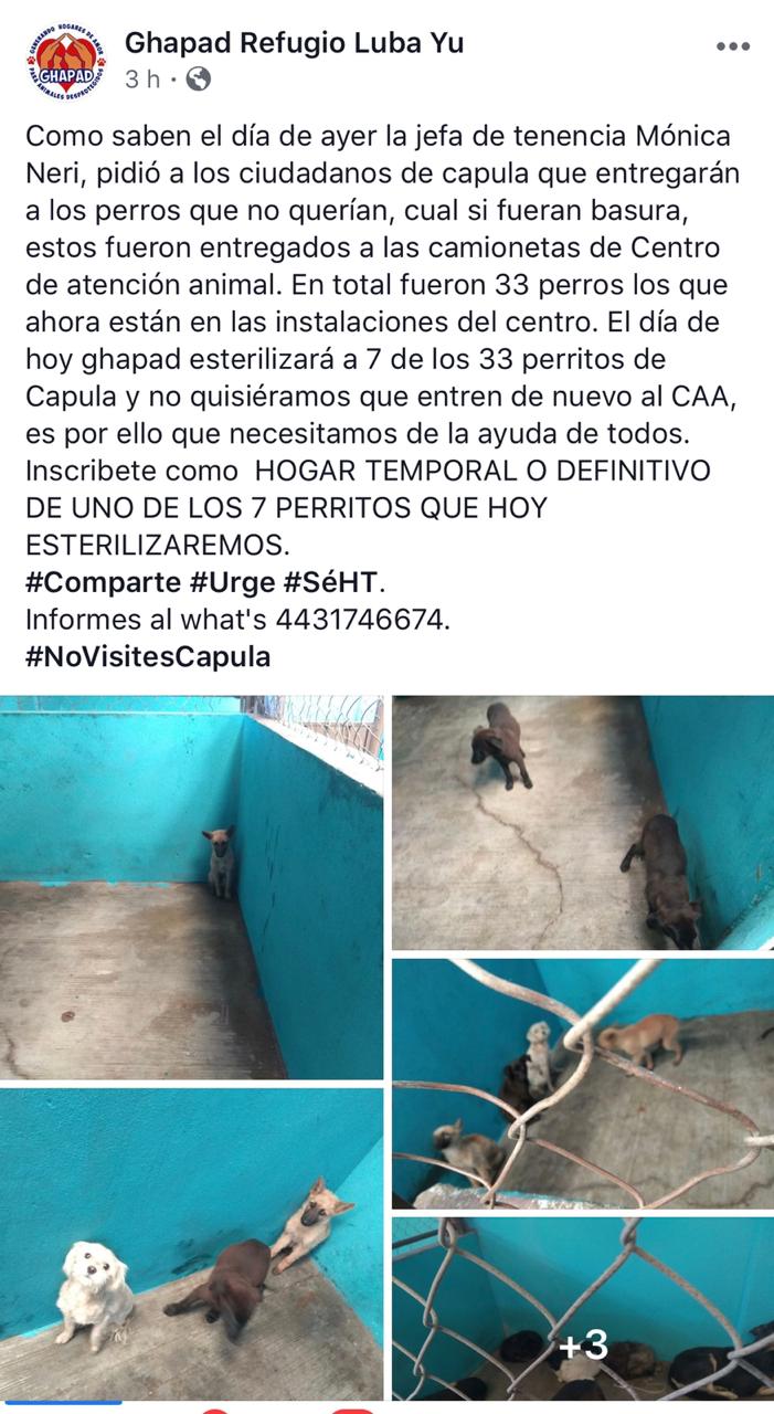 “Como saben el día de ayer la jefa de tenencia Mónica Neri pidió a los ciudadanos de Capula que entregaran a los perros que no querían cual si fuesen basura […] no quisiéramos que entraran de vuelta al Centro de Atención Animal por lo que buscamos hogares aunque sean temporales para los animales”, se lee en una de las publicaciones en redes sociales.