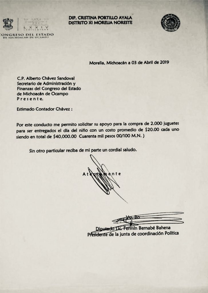 Son dos oficios los de la diputada Cristina Portillo Ayala, uno fechado el tres de abril en el que solicita se le entreguen 40 mil pesos para la compra de dos mil juguetes para entregar el día del niño, sin mediar cotización formal de alguna comercializadora o tienda de juguetes.