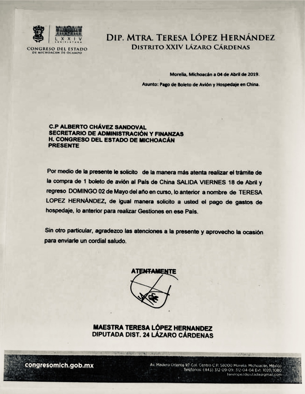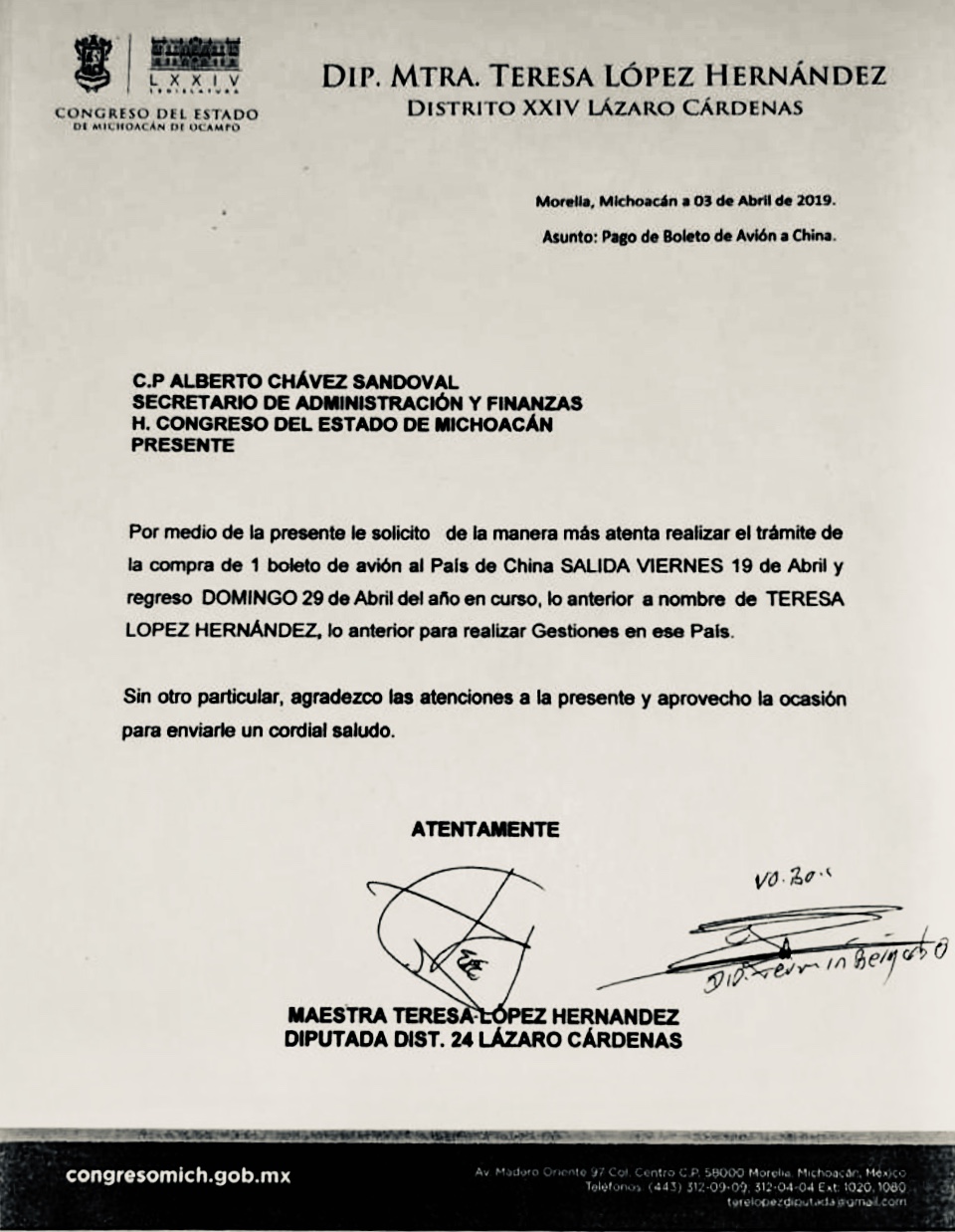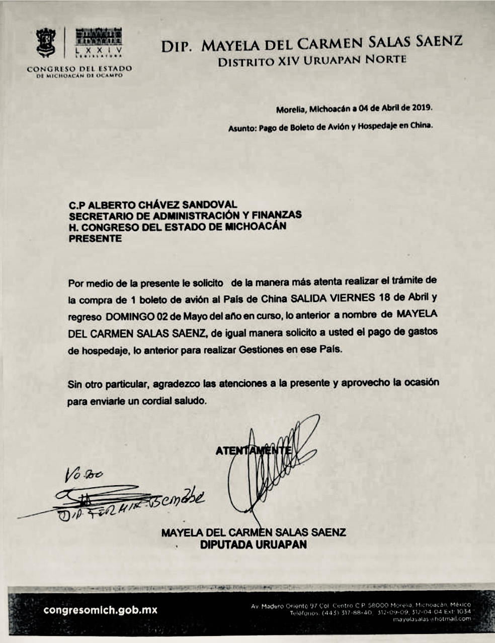 Sin embargo, en el oficio fechado el cuatro de abril previo a su salida a China, la diputada Mayela Salas solicita al secretario de Finanzas del Congreso, Alberto Chávez Sandoval, “realizar el trámite de la compra de un boleto de avión al país de China salida viernes 18 de abril y regreso domingo dos de mayo del año en curso, lo anterior a nombre de Mayela del Carmen Salas Sáenz, de igual manera solicito a usted el pago de gastos de hospedaje, lo anterior para realizar gestiones en ese país”.