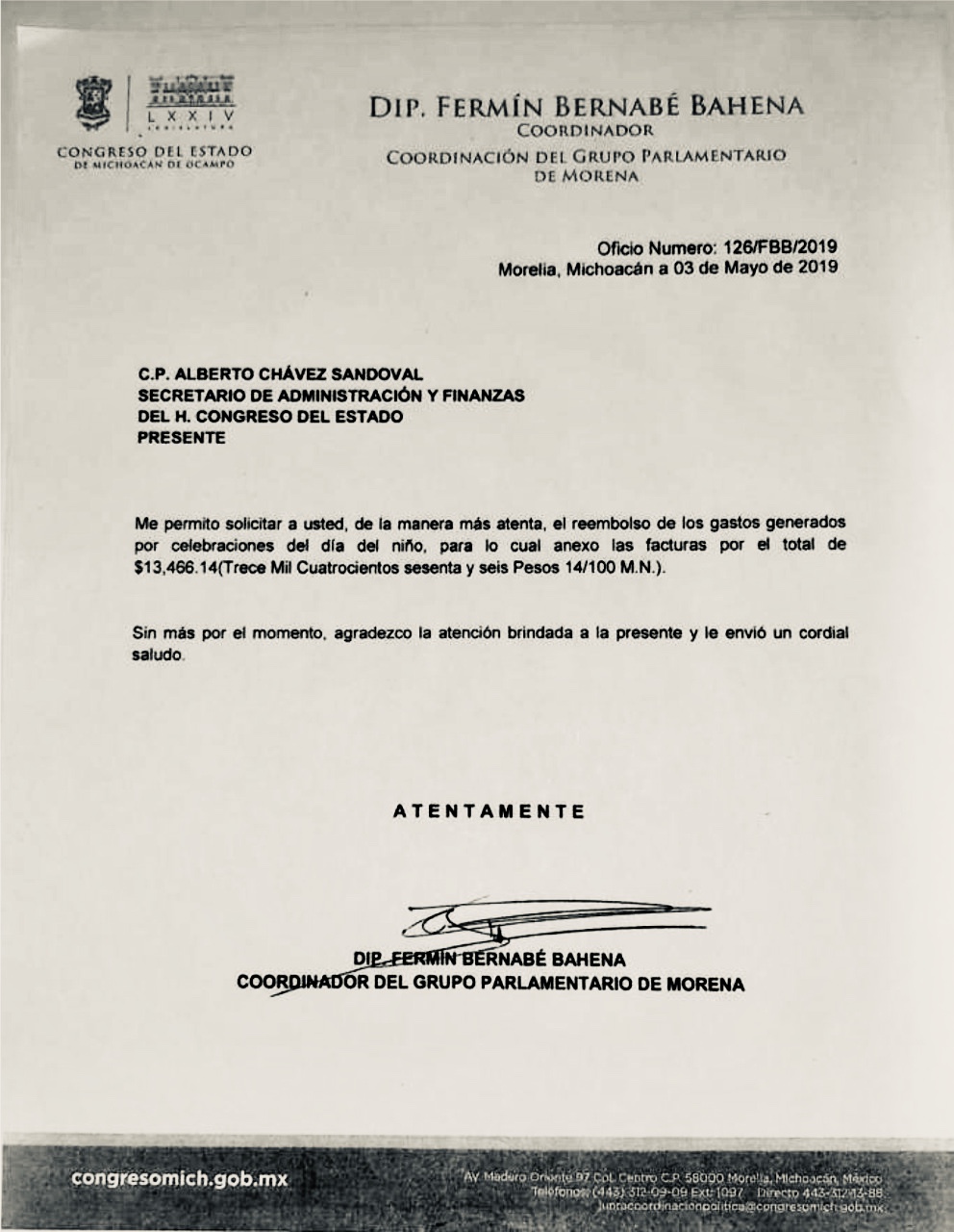 Por lo que toca al coordinador parlamentario Fermín Bernabé éste turnó el tres de mayo un oficio a finanzas para que se le reembolsaran 13 mil 466.14 pesos como “reembolso de los gastos generados por celebraciones del día del niño”, esto pese a que el monto mensual para gestoría asignado por diputado es de cinco mil pesos.