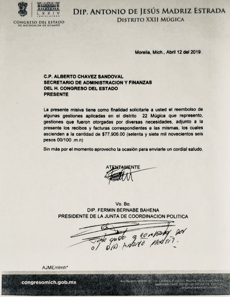 En el caso del diputado Antonio de Jesús Madriz Estrada no se queda corto, de manera que el 12 de abril solicita se le entreguen 77 mil 906 pesos como reembolso de “algunas gestiones aplicadas en el distrito 22 de Múgica”.