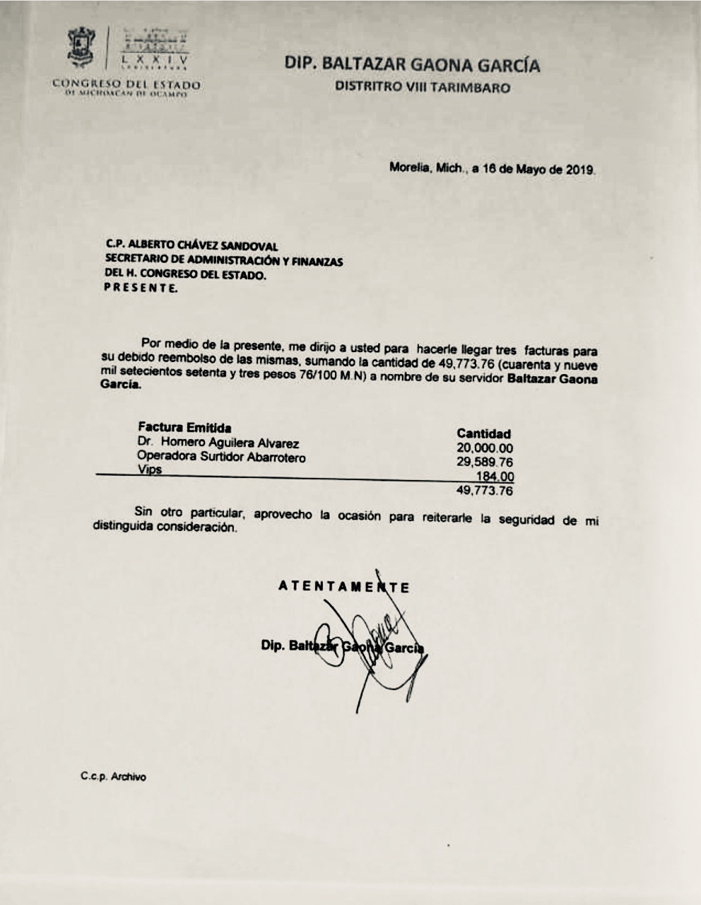 También entre los oficios se encuentra uno del legislador petista Baltazar Gaona Sánchez quien, solicita también el reembolso de recursos a la Secretaría de Finanzas del Congreso.