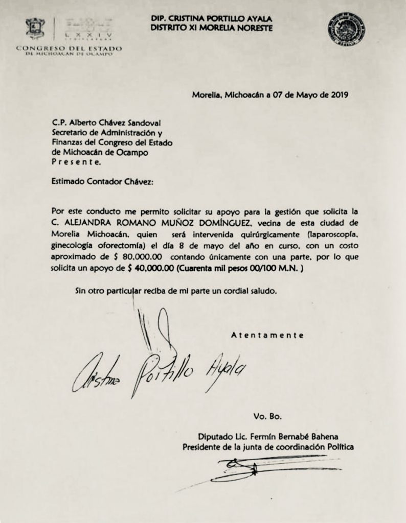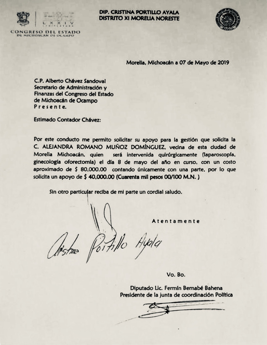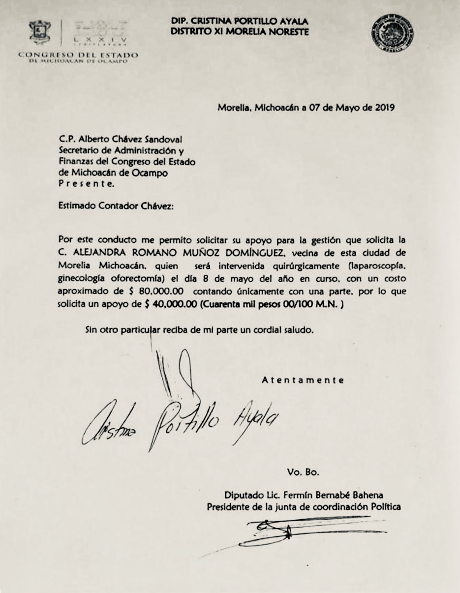 El otro oficio de Portillo Ayala data del siete de mayo, en donde vuelve a pedir que se le entreguen 40 mil pesos, bajo el argumento de una gestión solicitada por Alejandra Romano Muñoz “vecina de esta ciudad, que será intervenida quirúrgicamente”, sin mediar algún documento de alguna Institución Médica que valide lo dicho en el oficio.