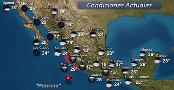 Morelia, Michoacán.-El huracán ‘Patricia’ ya subió a categoría 5, la máxima en la escala Saffir-Simpson, avanza al Nornoroeste a 17 kilómetros por hora a 320 kilómetros por hora al sur de Manzanillo, con vientos de 260 kilómetros por hora y rachas de 315 kilómetros.