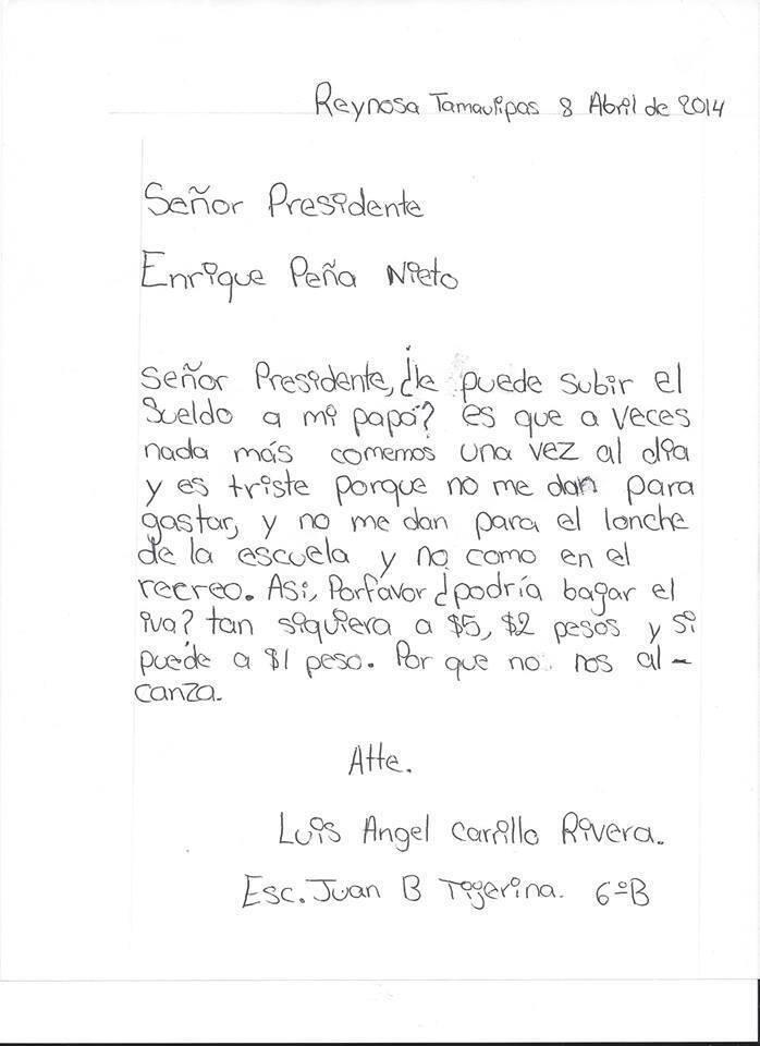 Un niño de Reynosa Tamaulipas le escribió una carta a Enrique Peña Nieto, en la que le pide que le suba el sueldo a su papá y reduzca el IVA, porque a su familia “no les alcanza”.