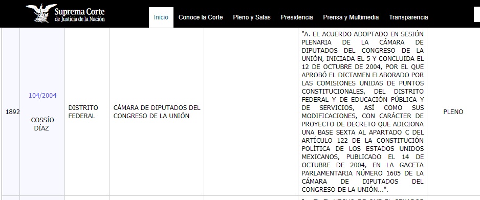 Para entonces el Gobierno Capitalino promovió la controversia constitucional 104/2004 en contra del Congreso de la Unión por la reforma aprobada en 2004 a la Constitución Política de México al artículo 122, asunto que fue resuelto en diciembre de ese año con un proyecto de sentencia elaborado por la ponencia de José Ramón Cossío Díaz.