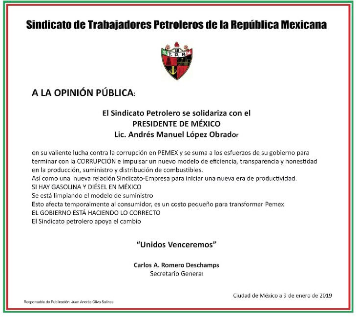 Por medio de un comunicado de prensa, el sindicato señala que se solidariza con el Ejecutivo federal en su valiente lucha contra el ‘huachicoleo’.