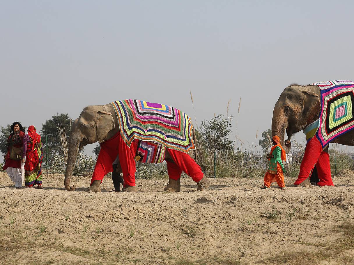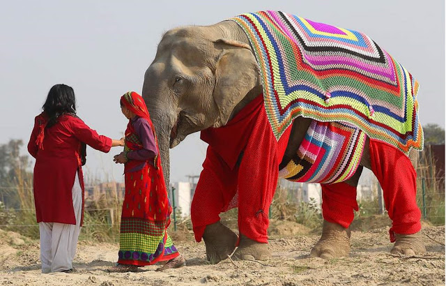 Los elefantes en la India lucen coloridos jumpers de lana después de que los aldeanos tejieran las prendas de gran tamaño para proteger a los animales de las temperaturas cercanas a la congelación.