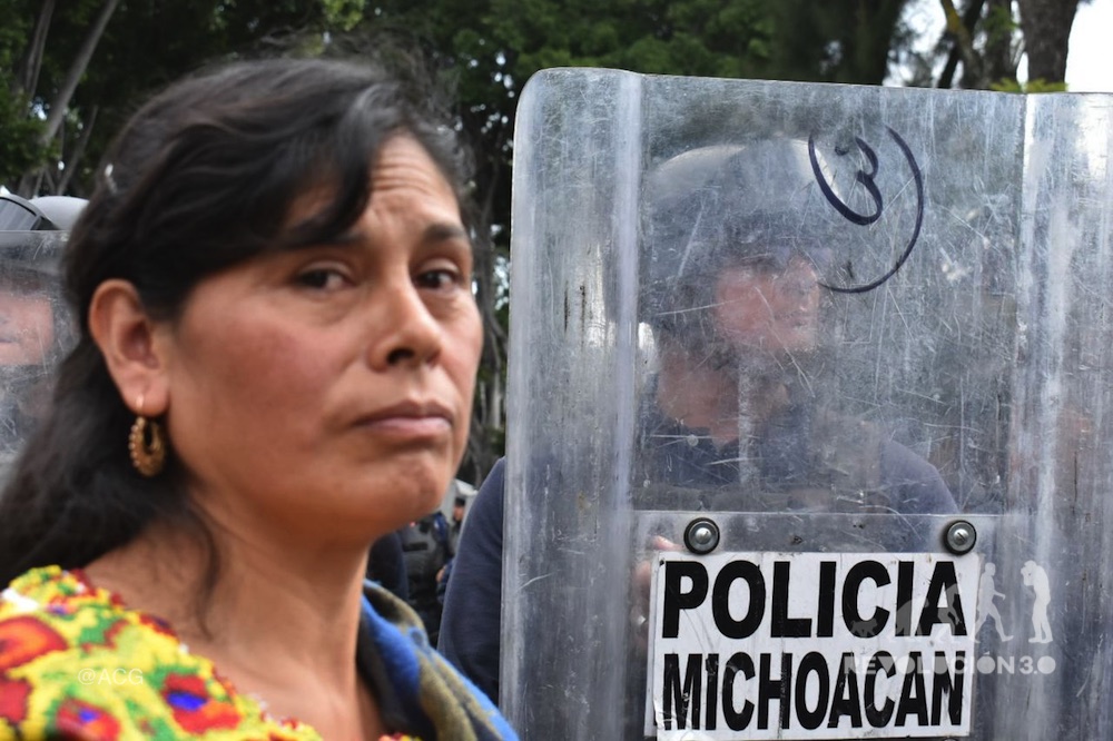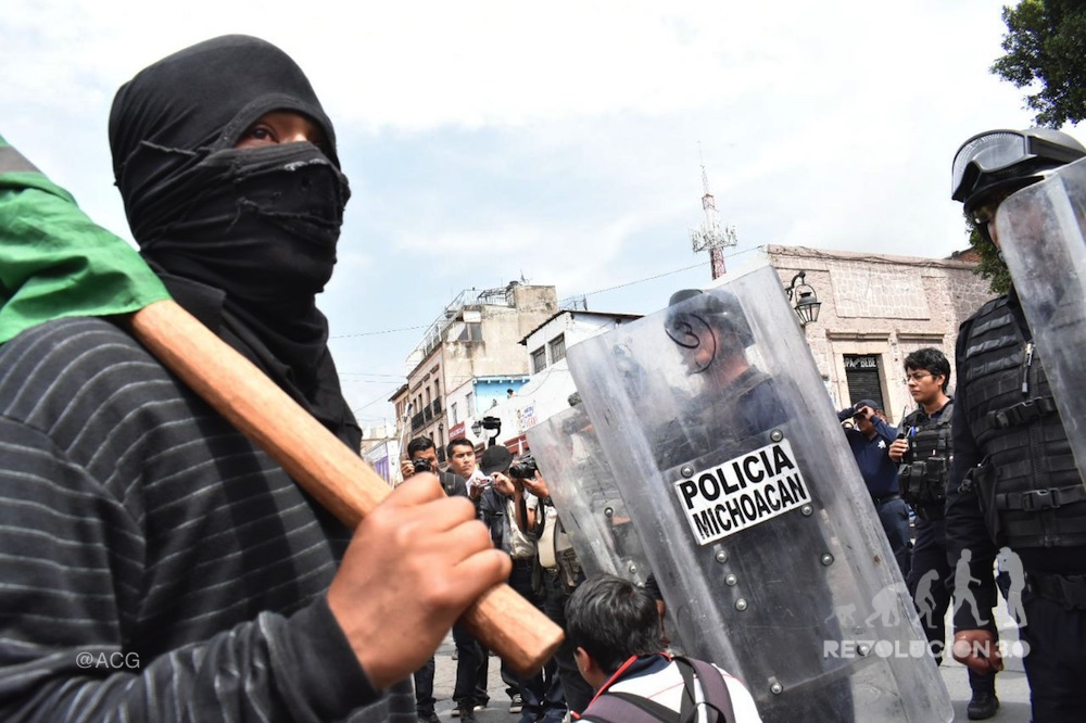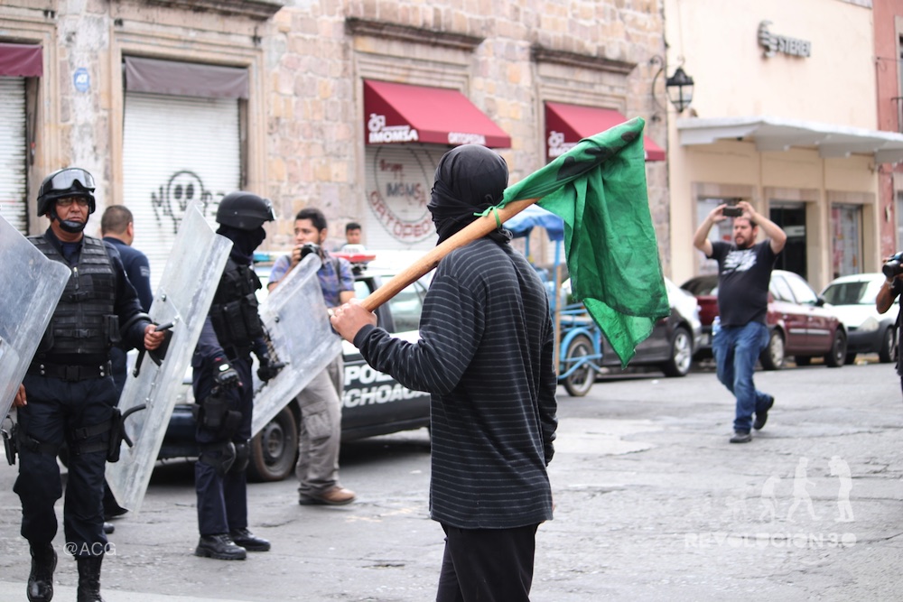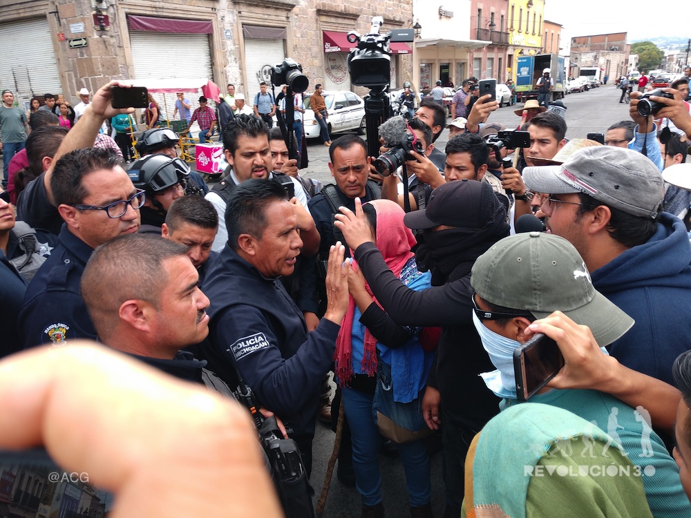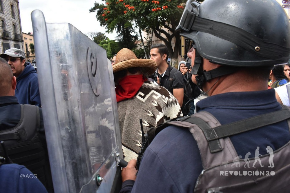 Un contingente policial estimado en 600 elementos pretende contener el avance de la marcha del Frente Nacional de Lucha por el Socialismo (FNLS) a la altura de Madero y Cuautla, donde los encargados del operativo piden a los manifestantes dejen palos que portan.