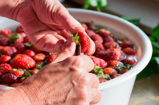 Generalmente traen tierra y pueden venir contaminadas. Lava las hojas de espinacas, acelgas, cilantro, perejil, etc, varias veces bajo el chorro de agua, para retirar toda la tierra que puedan traer. Las fresas, cuya hoja está pegada a la fruta, es importante nunca quitarla antes de lavarlas y desinfectarlas.