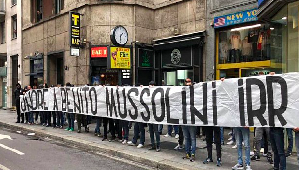 Los ultras desplegaron la manta en la plaza Loreto de Milán, conocida por ser donde  Mussolini fue colgado por los partisanos italianos en 1945.