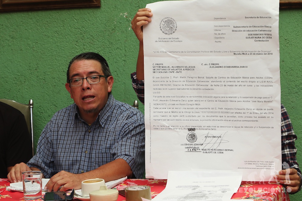 En rueda de prensa, el exdirigente estudiantil del movimiento que generó la huelga más larga en la historia de la Universidad Nacional Autónoma de México (UNAM) en contra del aumento de cuotas en la institución, mostró un documento donde Martín Peregrino Bernal, subdirector del Centro de Educación Básica para Adultos (CEBA), señala que “no existe ningún oficio para la retención del pago” a Echevarría, quien presta sus servicios en Álvaro Obregón.