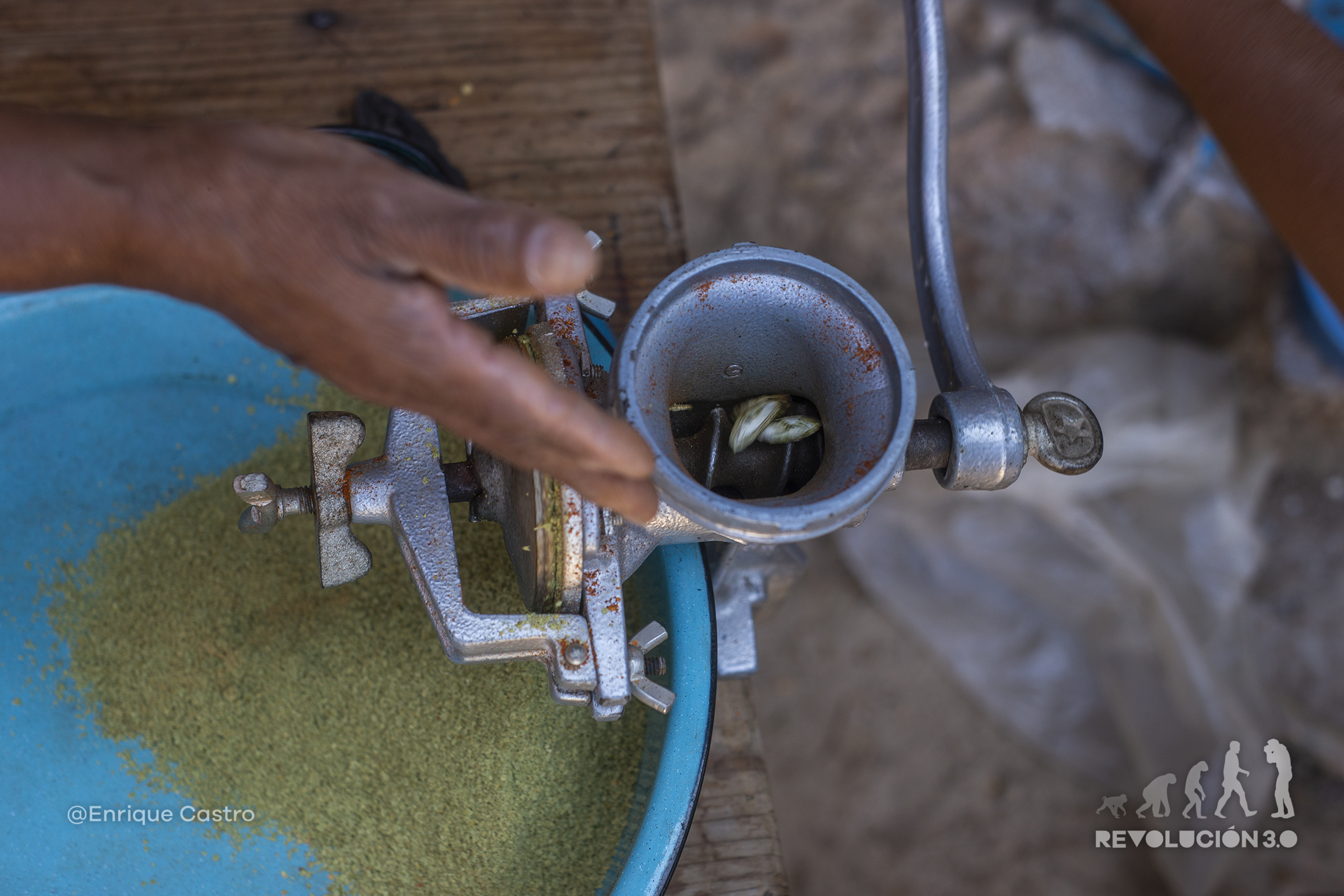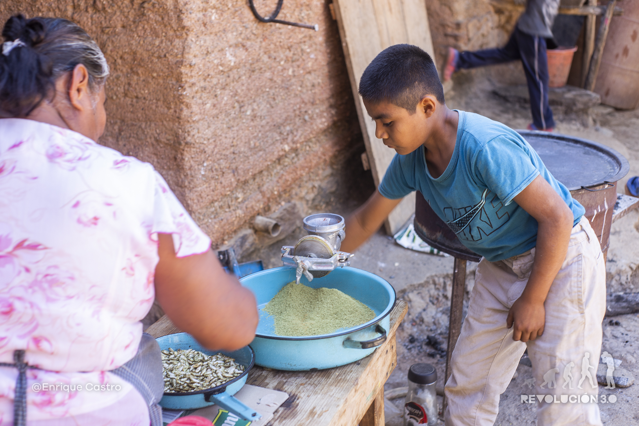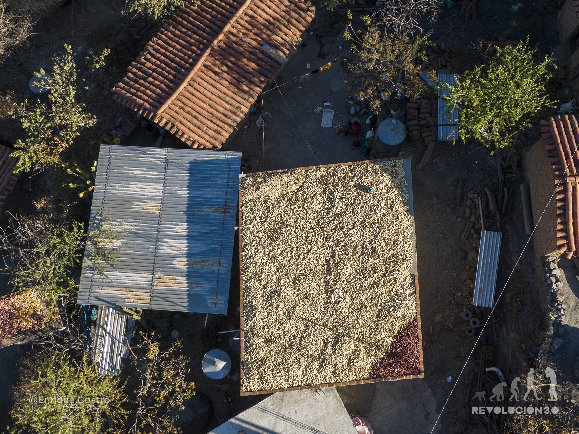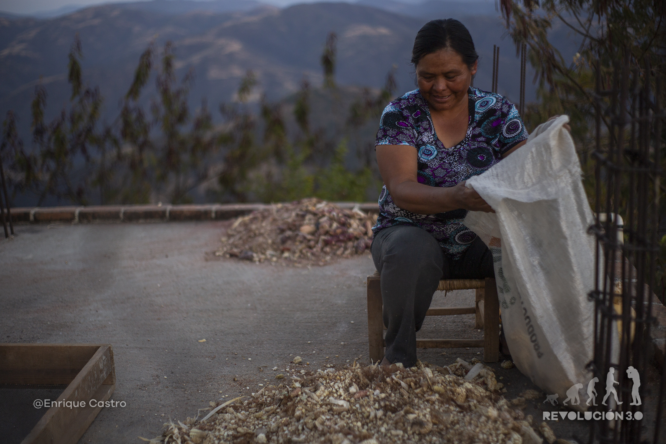 El maíz es la alimentación primordial; después de la cosecha, se pone en las azoteas a secar para después desgranar y almacenar para comer durante el año. Semillas diferentes se muelen para crear condimentos para moles y sazonar los alimentos; toda la familia es participe de cada uno de los procesos.