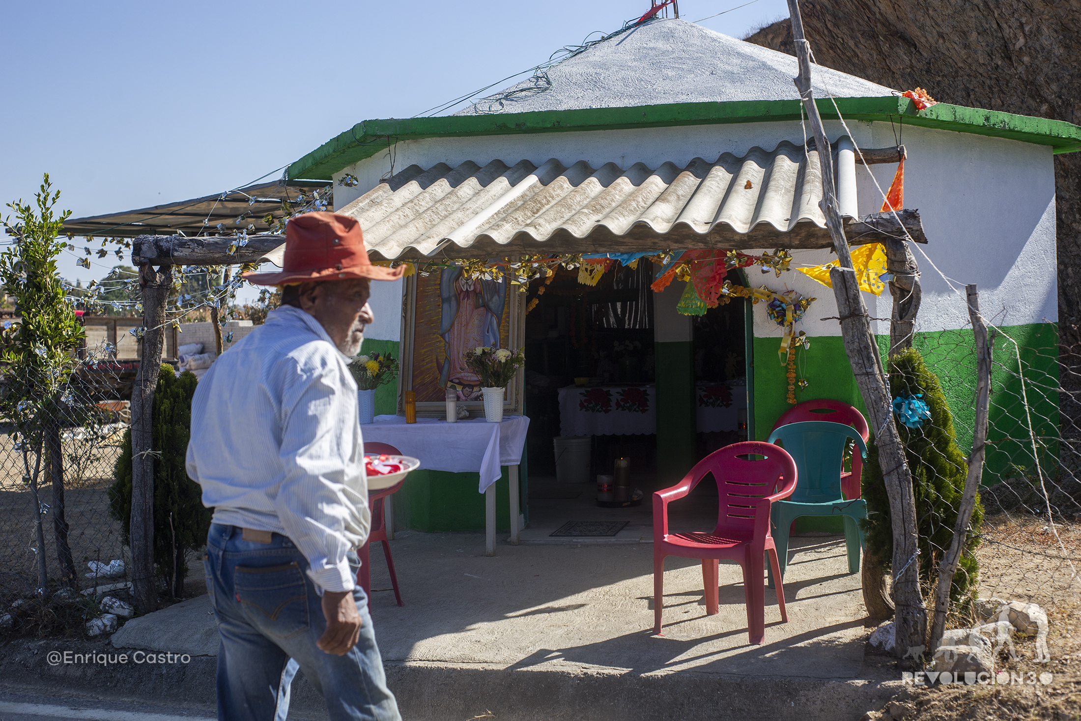 Sobre la única carreta, un hombre hace guardia y pide cooperación a los vehículos frente a un altar de la Virgen de Guadalupe, eso para las fiesta decembrinas para honrarla. Los altares son adornados y se realizan rezos los días anteriores al 12 de diciembre.