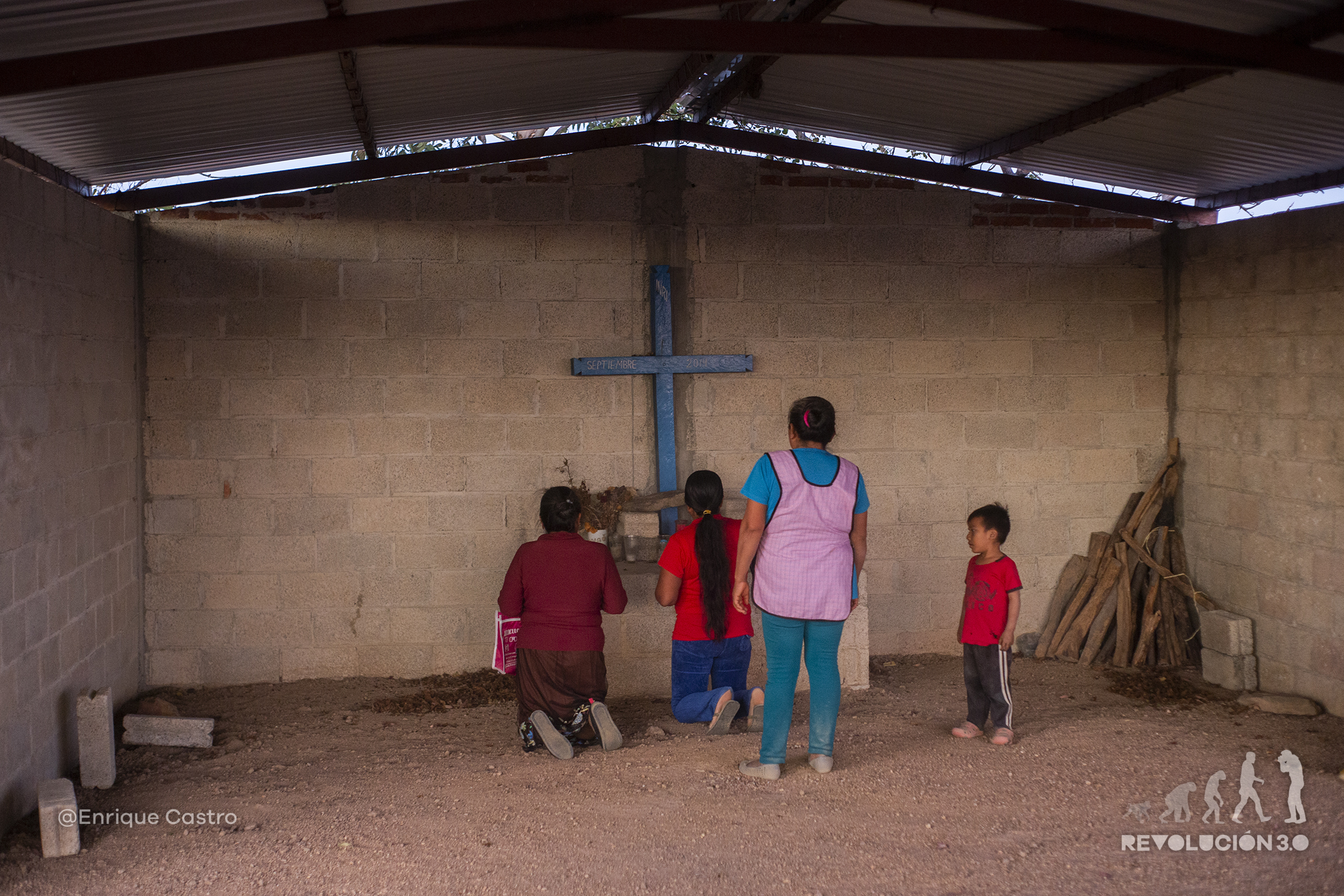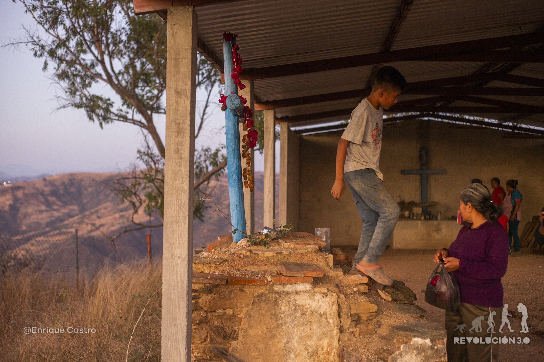 En Lomalapa, al atardecer se santifica un altar, previo a una ceremonia Nahua de agradecimiento a la tierra. Las mujeres ofrecen incienso y con ayuda de los niños se colocan collares de flores en las cruces.